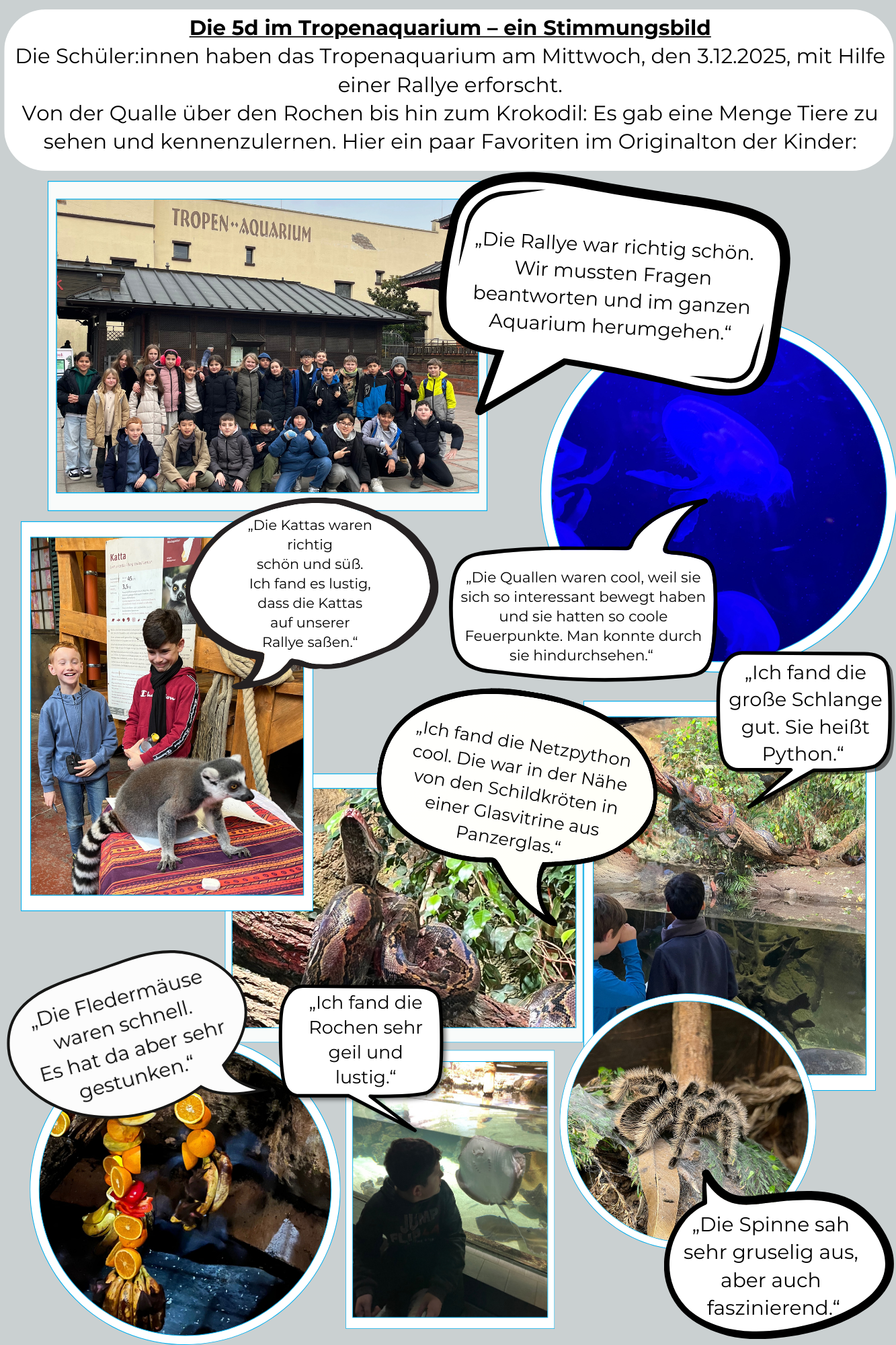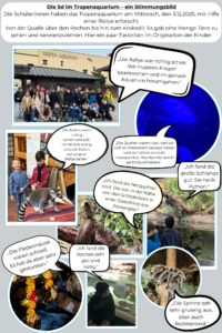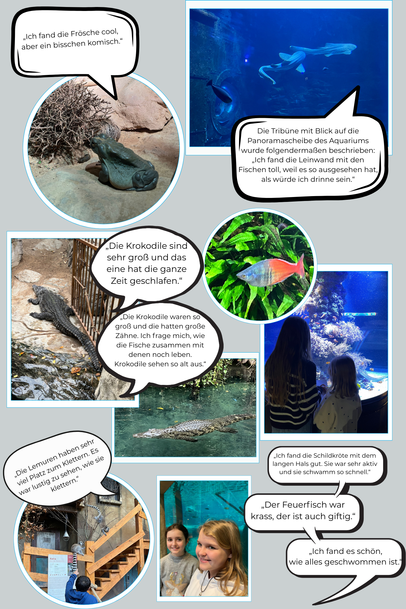 Am 15. Oktober war es soweit: Die erste von insgesamt vier 5. Klassen machte sich auf den Weg ins Tropenaquarium – und wurde gleich zu Beginn herzlich von den Kattas, einer kleinen Lemurenart, begrüßt. Begeistert und staunend tauchten die Kinder danach in die geheimnisvollen Unterwasserwelten ein: Bunte Korallenriffe, geheimnisvolle Höhlen und beeindruckende Meeresbewohner luden zum Entdecken ein. Große Freude herrschte beim Wiedersehen mit den bekannten Filmfiguren Dorie und Nemo, die in ihren Becken neugierig vorbeischwammen. Ein besonderes Highlight war die Haifütterung, die die Klasse aus nächster Nähe miterleben durfte – ein spannender Moment, der für viel Staunen und Gesprächsstoff sorgte! „Richtig gut fanden wir die Rochen, wir konnten diese gut an der Scheibe beobachten und sie sind unseren Händen gefolgt“, so eine Schülerin im Anschluss an den Ausflug. Zusätzlich gab es für jede Klasse einen kleinen Imbiss vor Ort, auf den sich die Kinder freuen konnten. Die Fotos zeigen wie begeistert und voller Entdeckerfreude unsere Schülerinnen und Schüler sind. Dieses besondere Erlebnis bleibt sicher noch lange in Erinnerung – und wir freuen uns schon auf die nächsten Klassen, die dieses Abenteuer erleben dürfen! Ein herzliches Dankeschön an die Stiftung Kinderjahre für diese wunderbare Möglichkeit!