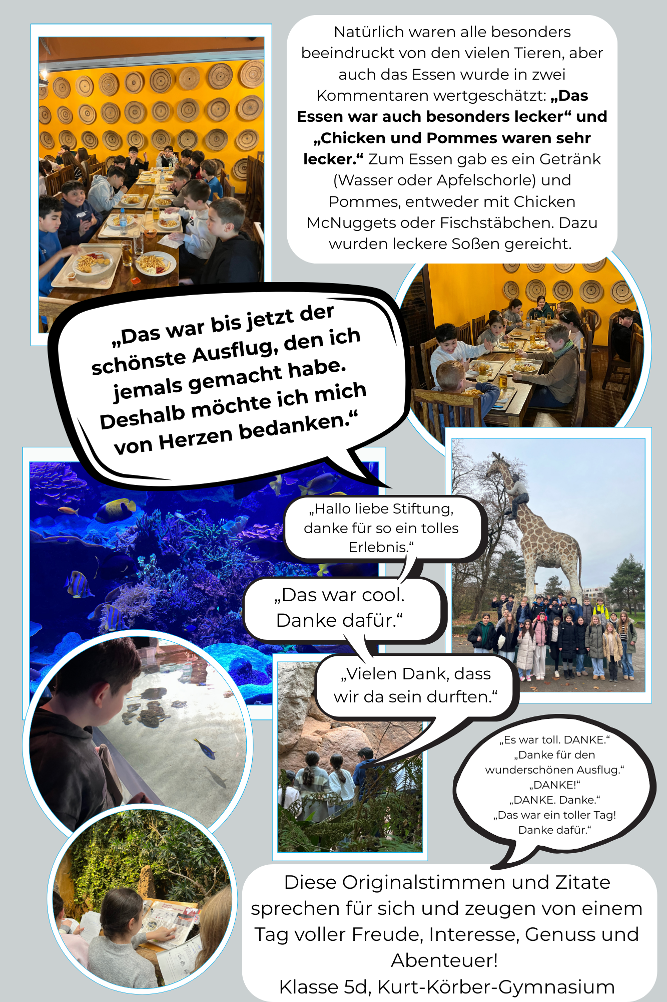 Die Stiftung Kinderjahre ermöglicht unserer Schule, in diesem Jahr mit allen 5. Klassen kostenfrei das Tropenaquarium im Hamburger Tierpark Hagenbeck zu besuchen! Dieses tolle Erlebnis bietet unseren Schülerinnen und Schülern die Chance, hautnah faszinierende Tier- und Pflanzenwelten zu entdecken. Besonders bereichernd ist das pädagogische Angebot des Tropen-Aquariums, Naturkunde zum Anfassen. Die Klassen nehmen an altersgerechten Rallyes teil, die sie eigenständig durch die verschiedenen Lebensräume führen oder bekommen die Möglichkeit einer pädagogisch begleiteten Führung, bei der die Kinder hinter die Kulissen schauen und von Fachleuten spannende Einblicke in die Haltung und Versorgung der Tiere erhalten.