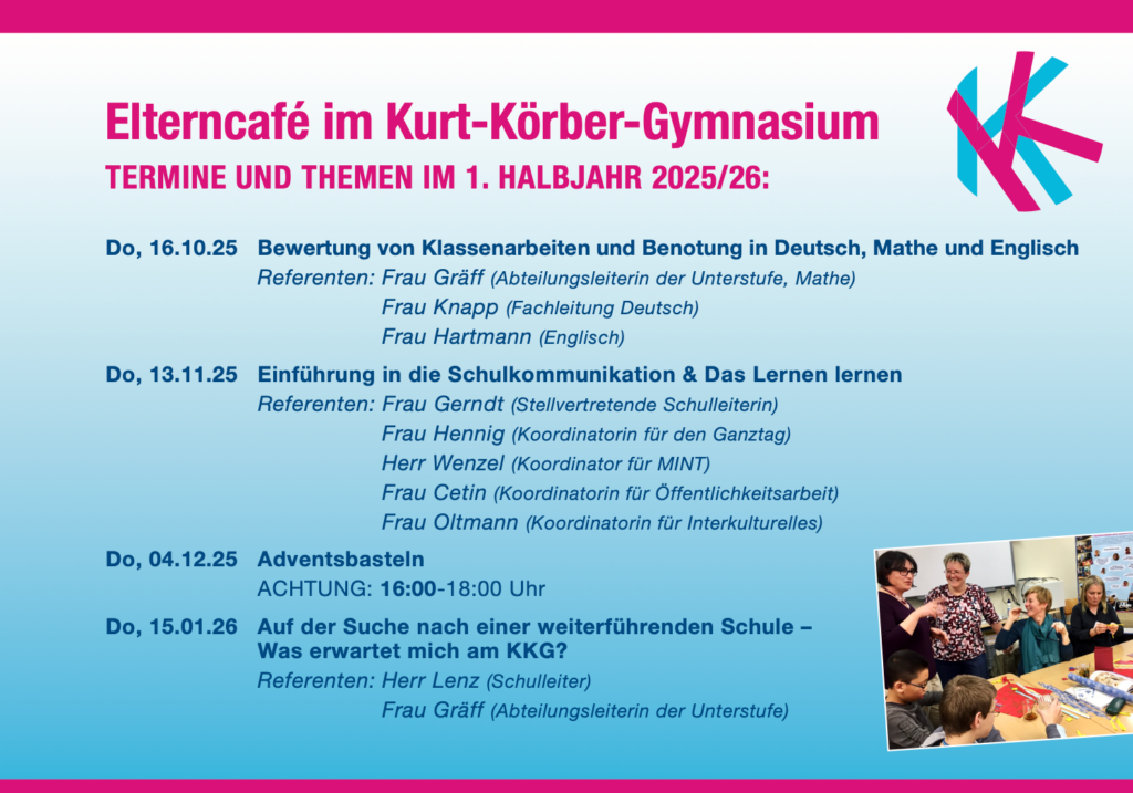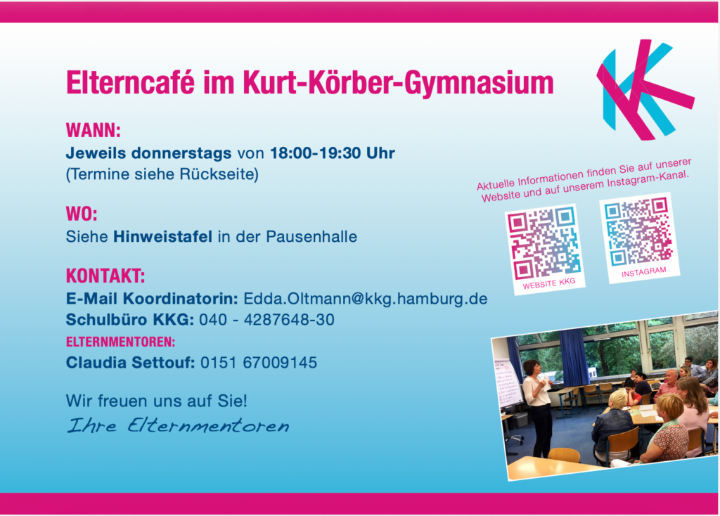 Zu jedem Elterncafé laden wir vorher per E-Mail-Verteiler und per Mitteilung auf der KKG-Webseite sowie bei Instagram ein.